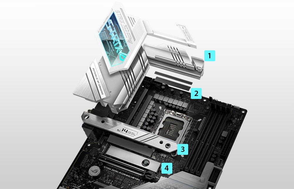 With four strategically placed M.2 slots, ROG Strix Z690-A Gaming WiFi D4 takes full advantage of CPU and chipset bandwidth to usher in support for dizzyingly quick PCIe® Gen 4.0 SSDs, lightning-fast Intel NVM Express® RAID, and high-capacity drives that blaze past traditional SATA-based storage.