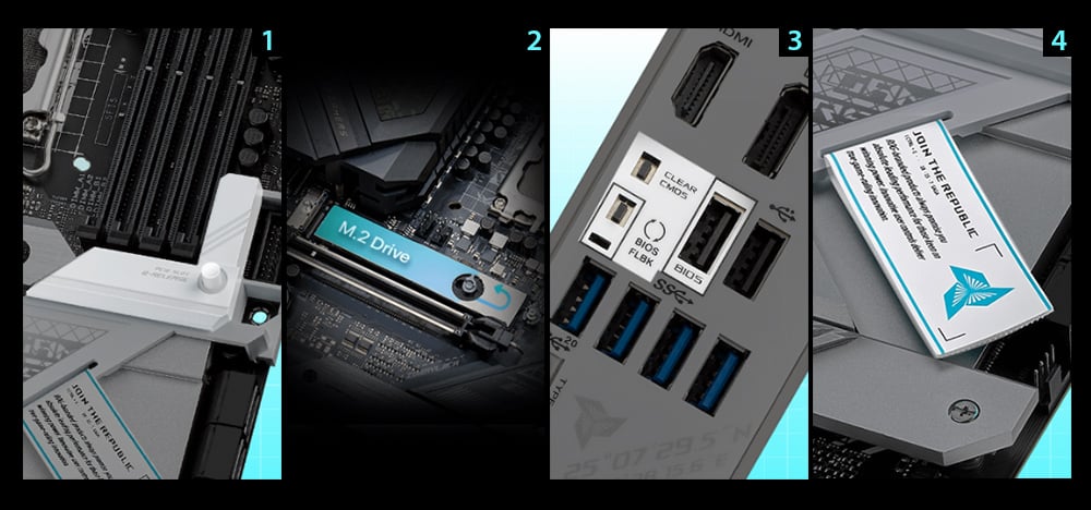 A physical button located on the chipset heatsink unlocks the first PCIe slot’s security latch with one tap, greatly simplifying the process of detaching a PCIe card from the motherboard when it’s time to upgrade to a new GPU or other compatible device.M.2 Q-LATCH