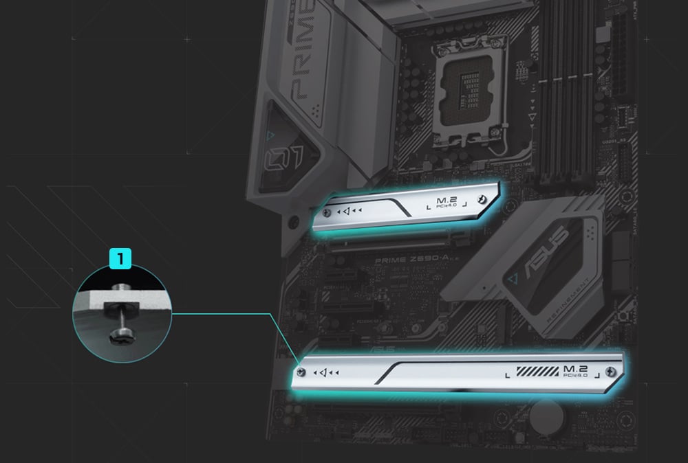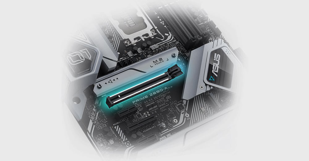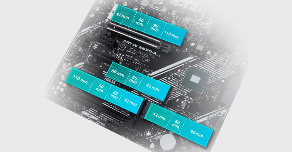 Prime Z690-A offers a total of four M.2 slots that support data-transfer speeds of up to 64 Gbps via PCIe® 4.0, enabling quicker boot-up and app load times with OS or application drives.
