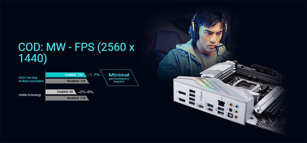 *Testing configuration: CPU: 11th Gen Intel Core Processor ; Motherboard: ROG MAXIMUS XIII HERO; Graphics card: NVIDIA RTX 3070; DRAM: G.SKILL F4-3200C16Q-32GVK; Power: SUPER FLOWER 550W; HDD: ADATA SX910 SSD 128G; Cooling: Enermax T.B.APOLLISH; Game: CALL OF DUTY: MODERN WARFARE ; Voice Communication App: Discord (In-app noise canceling effects disabled) ; Background noise: Keyboard typing, mouse clicking, people talking, and music playing